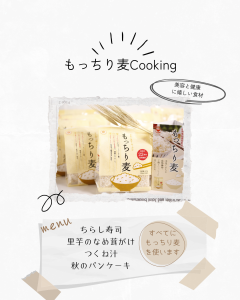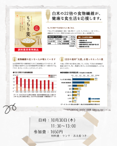 参加費 1650円(材料費、ランチ、レシピ、もっちり麦のお土産つき)